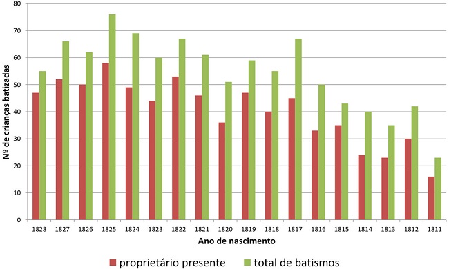 Verificamos que tais escravistas eram responsáveis por quatro em cada cinco batismos (81,6%) ocorridos nos três últimos anos do lapso em tela (1826, 1827 e 1828). A participação tendeu a declinar à medida que recuamos no tempo até o início do período: entre 1818 e 1825 oscilou em torno de 74,8%, e de 68,8% nos primeiros sete anos considerados (1811 a 1817). Os resultados devem ser interpretados não apenas em função de eventuais emigrações de iguapenses ou da presença de não iguapenses batizando seus cativos na paróquia, como também da própria possibilidade de morte dos escravistas. E isto em que pese nosso esforço já mencionado com vistas à recuperação de informações, através da localização de eventuais herdeiros, no cotejo entre os dois diferentes tipos de fontes primárias compulsadas. Ademais, com o número de batismos superando os 50 casos por ano a partir de 1817, o que refletiu o próprio crescimento da população escrava na região, o universo de proprietários ampliou-se, favorecendo sua identificação no rol de moradores.