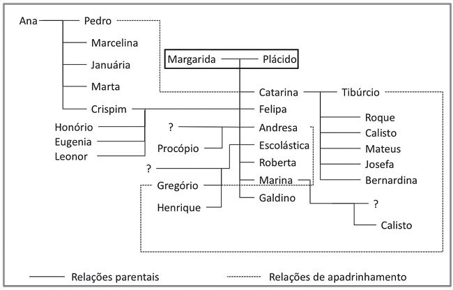 Escolhemos, não obstante, outro proprietário para conformar um derradeiro estudo de caso. O açoriano Antonio Borges Diniz, conforme indicado na tabela 1, constou como dono das crianças em 73 batismos registrados entre 1811 e 1850, representando isoladamente a maior frequência.37 Ao realizar seu testamento, em 1861, declarou: "(...) que se algum meu cativo aparecer com carta de liberdade será atendido. Declaro que não libertei alguns mais, como são as cativas Margarida (sic), que foi a primeira crioula, que teve sete filhos e estas me teve dado muitas crias, espero que seja bem tratada, digo bem passada em sua velhice".38 Encontramos Margarida, preta, natural de Iguape, na lista nominativa de 1815, então com 13 anos. O futuro pai de suas crianças também estava lá: Plácido, igualmente natural de Iguape, 27 anos, negro, provavelmente uma aquisição feita por Diniz a João Antonio da Costa Mendonça que possuía, em 1801, o jovem Plácido, então com nove anos. Entre 1822 e 1842, nasceram as sete crianças, sendo seis meninas. Até 1850, acreditamos que as filhas Catarina (cinco filhos), Felipa (três filhos), Andresa (um filho), Escolástica (dois filhos) e Marina (um filho) constituíram o grande núcleo familiar originado da união entre Plácido e Margarida (descrito na figura 1), totalizando assim 19 dos 73 batismos. Possivelmente, enquanto Borges Diniz redigia seu testamento, Margarida acalentava seus primeiros bisnetos, compondo assim quatro gerações em cativeiro.