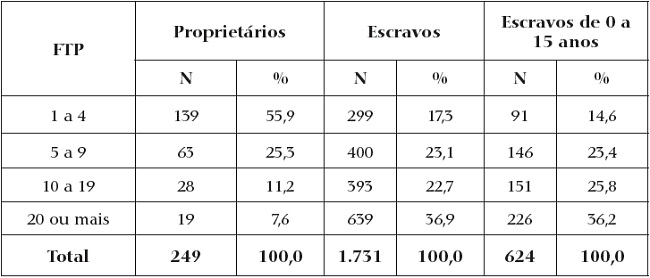 Na tabela 2, apresentamos os escravistas e seus cativos distribuídos segundo faixas de tamanho das posses, destacando em separado os escravos com 15 ou menos anos de idade, os quais nos remetem aos casos de crianças batizadas a partir de 1811. Além da distribuição que concentra os cativos nas maiores posses pertencentes a um pequeno número de escravistas, notamos que essas propriedades também agregavam a maior parte dos escravos com 15 anos ou menos. No entanto, salientemos que esse grupo etário compunha parcelas que oscilavam entre 30% a 38% do total de pessoas em todos os segmentos de tamanho das escravarias.16