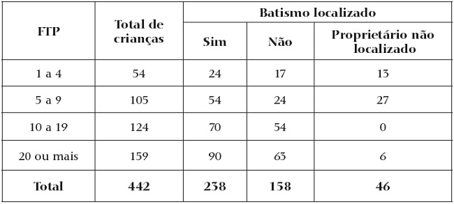 O resultado reafirma o padrão de concentração de crianças nas propriedades com maior número de escravos (64,0% das crianças presentes nas posses com 10 ou mais pessoas). No que respeita à segmentação a partir do cruzamento com os assentos paroquiais, observamos, nas escravarias menores (até nove cativos), constarem no livro de batismos 65,5% das crianças, contra 57,8% nas maiores posses.
