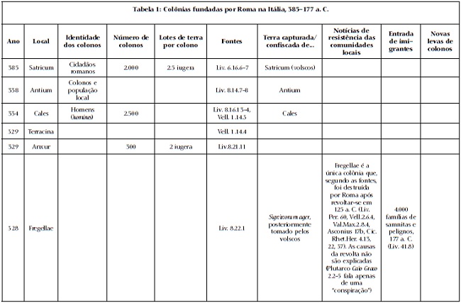 O processo teria se desenvolvido de tal maneira que, quando chegamos em 194 a. C. - momento em que Lívio nota a fundação de uma série de colônias de "cidadãos romanos" na Campânia, Magna Grécia e Apúlia -, podemos inferir que muitos dos "cidadãos" enviados a essas colônias vinham, possivelmente, das cidades tirrênicas que receberam cidadania romana nos séculos IV e III a. C., como também de várias outras regiões na Itália central onde tribos de cidadãos romanos haviam sido criadas ao longo do século III a. C. (tabela 3). Evidentemente, o fato de que diversas comunidades italianas receberam "cidadania romana" a partir do século IV a. C. não necessariamente significa que o Estado romano estava mobilizando pessoas dessas comunidades até as colônias recém-fundadas. Entretanto, conforme veremos abaixo, as fontes referem-se explicitamente a episódios em que italianos de fora de Roma foram, supostamente, enviados a colônias, inclusive samnitas, umbros e vários outros povos (ethne) da Itália central (marsos, paelignos, marrucinos).