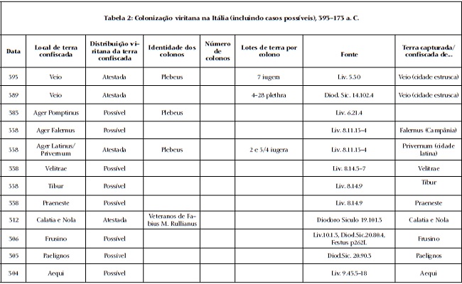 Por volta de 290 a. C., ocorrem os primeiros confiscos de terra em larga escala na Itália central (a saber, o confisco do ager Sabinus: tabela 2). Àquela altura, já havia um número elevado de comunidades italianas cujos integrantes provavelmente possuíam cidadania romana.32 Tais indivíduos podem ter sido enviados como colonos às terras conquistadas por Roma a partir dessa data. Em outras palavras, a partir de meados do século IV a. C., havia um grupo crescente de comunidades italianas das quais os "colonos" mencionados nas fontes podem ter originado. Tal grupo de pessoas teria apenas aumentado com o passar do tempo, ao menos teoricamente.