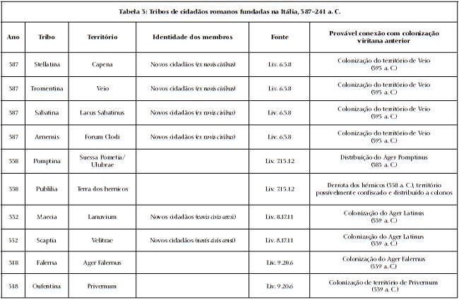 A tabela 3 revela correspondências entre a distribuição viritana de terras e a criação de tribos de cidadãos em determinados locais. Essas tribos teriam incluído os cidadãos que haviam sido enviados como colonos e seus descendentes.33 Pode-se inferir, com base na tabela 4, que tais cidadãos provinham não somente da cidade de Roma, mas também de várias partes da Itália central e meridional.