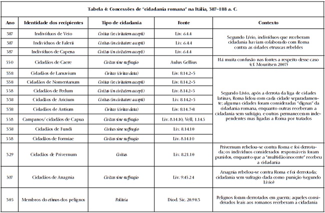 A tabela 4 reúne todas as referências nas fontes à concessão de cidadania romana na Itália entre os séculos IV e II a. C. Vemos que Lívio, o autor que mais figura na lista, frequentemente emprega a fórmula civitas data - isto é, ele simplesmente constata que a "cidadania foi dada", sem especificar quais direitos e deveres estavam sendo concedidos ou trocados. A mesma indefinição está presente em Diodoro Sículo, que se refere simplesmente à concessão da politeia a certos pelignos (um ethnos da Itália central) que haviam permanecido fiéis a Roma após uma revolta em 305 a. C.44