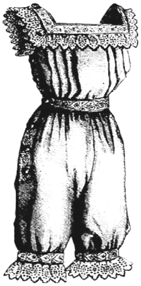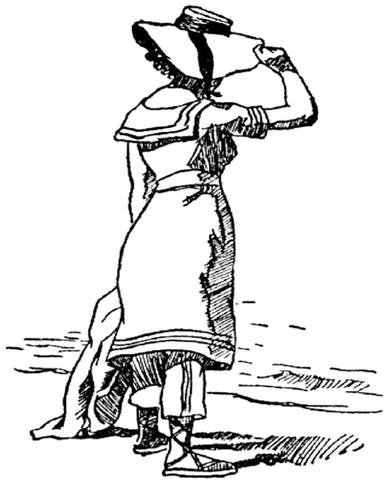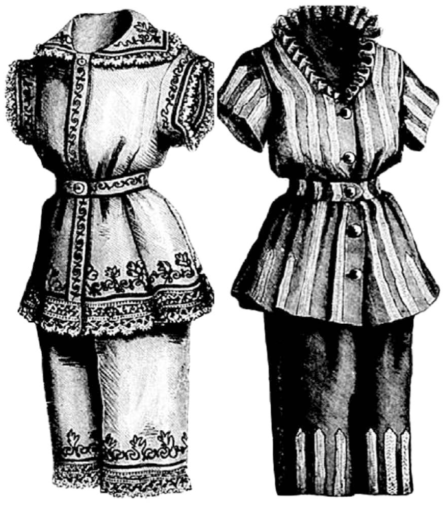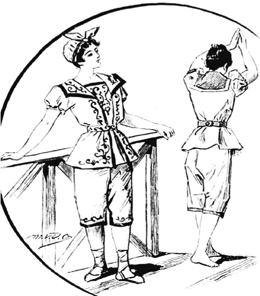 Pelos números de A Estação, periódico que tinha a moda como assunto principal,64 podemos acompanhar as sugestões de vestimentas para as mulheres que procuravam os banhos de mar e a natação. Em 1879, apresentou-se o seguinte modelo: "A blusa e a calça são abotoadas, uma à outra, no cinto sofrivelmente largo, pregado de modo a correr com facilidade. Este modelo, de baetilha branca, é apertado por uma faixa, e enfeitado de bordado a ponto de marca".65