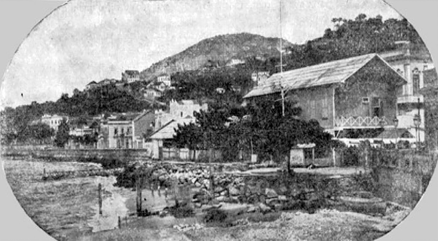É interessante perceber que o clube passou a promover melhorias na praia da Lapa, a fim de melhor acolher não somente os que vinham em dias de regatas, como também os que frequentavam cotidianamente sua sede.135 Na imagem a seguir, vemos o barracão da agremiação, ao lado do Passeio Público, na fronteira com a praia do Boqueirão do Passeio. Para que se tenha uma ideia, o prédio branco que se situa atrás da sede é do Silogeu Brasileiro, onde hoje está o prédio do Instituto Histórico e Geográfico Brasileiro.