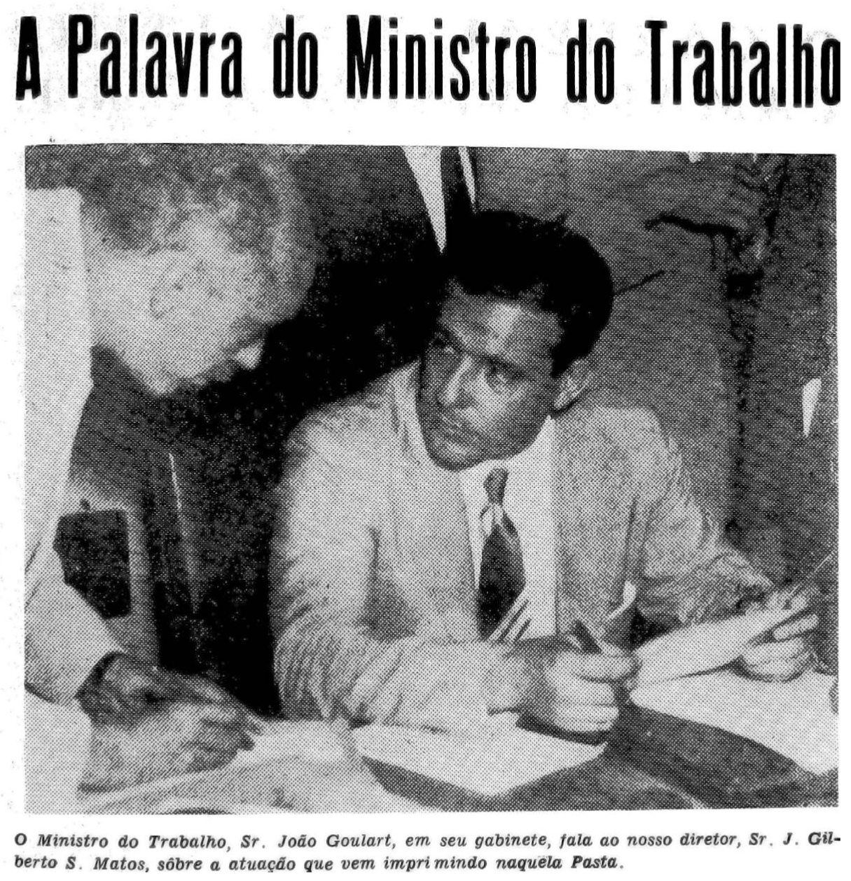 Conciliador habilidoso, executor de uma "política de tolerância", herdeiro do "carisma" de Vargas (cogitado como seu sucessor nas eleições presidenciais), político cujo comportamento representou uma "revolução" (palavra nada ingênua) no Ministério do Trabalho, promovendo uma espécie de desmistificação da autoridade, "o ministro que conversava" (e aplicava as leis?!) - foram alguns dos atributos conferidos à gestão de João Belchior Marques Goulart na Pasta do Trabalho, nomeado ministro de Estado aos 35 anos. Jovem em idade e também, de certa forma, em experiência política.40 Eleito presidente nacional do Partido Trabalhista Brasileiro desde 1952 (com a influência de Vargas), Goulart formou um importante canal de diálogo entre o partido e sindicatos, apesar das divergências do PTB no tocante às relações com o movimento sindical.