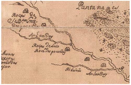 Na margem esquerda do rio Pardo, é representada a presença de ambientes rurais com a figura de uma edificação. No curso do rio recortado no mapa, aparecem cinco dessas pequenas casas. Nas proximidades de três delas são discriminados os proprietários das roças. Dos dois proprietários, encontramos na documentação apenas referência a Luís Rodrigues. O relato de Cabral Camelo aponta que,
