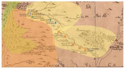 Nos mapas coevos, particularmente naqueles classificados por Jaime Cortesão como "sertanistas", 21 podemos perceber a representação de uma ampla rede urbana. Por outro lado, não há muitos indícios nesses mapas sobre a formação de ambientes rurais no imenso território habitado por inúmeros povos ameríndios e que, em poucos anos, nas primeiras décadas do século XVIII, foi incorporado aos domínios portugueses na América. Há ao menos um mapa, contudo, que faz referência às roças próximas ao rio Pardo. Trata-se da carta Parte do gouerno de Sam Paulo e parte dos dominios da Coroa de Espanha, datada de 1740 ( figura II). 22
