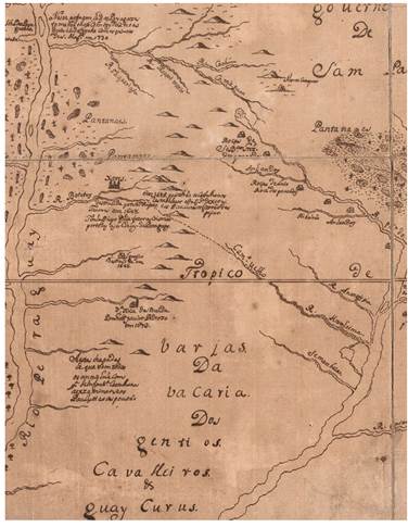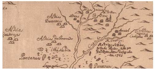 Em outro detalhe do mapa anteriormente citado ( figura VI), é possível perceber indícios da expansão das lavras e da muito significativa presença ameríndia.