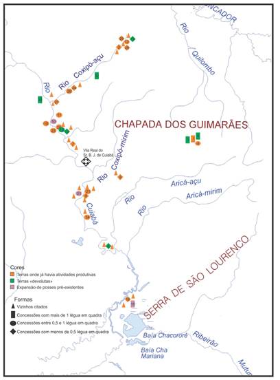 Quanto à localização das terras, algumas se situam nos caminhos que levam às Minas do Cuiabá, mas o maior número de concessões é referente às áreas situadas no rio Cuiabá, acima da Vila Real, no rio Coxipó-Açu e ainda na região da Chapada. Portanto, as terras onde há mais densidade de ocupação por ambientes rurais, de acordo com os relatos e correspondências - ou seja, entre a barra do rio Cuiabá e a Vila Real -, não estão onde há a maior quantidade de sesmarias.