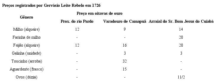 A racionalidade que guiava os empreendimentos era orientada por uma lógica mercantil que visava os altos lucros que poderiam ser obtidos com a venda de "mantimentos" aos que percorriam o caminho que levava às Minas de Cuiabá. Uma relação dos preços das mercadorias nos dá uma perspectiva do lucro que tais roças realizavam.