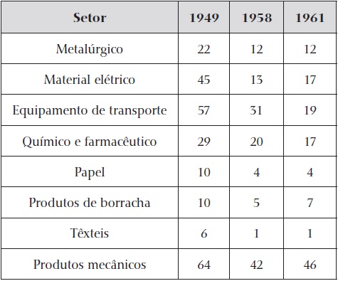 Luiz A. Corrêa do Lago et al., atestando o aumento da participação relativa da produção interna no atendimento do mercado doméstico, informa que, entre 1958 e 1961, o crescimento das importações em dólares cresceu 11,7%, enquanto o crescimento da produção real interna foi de 93,4%.34 Isto é, o Plano de Metas permitiu, tanto por meio de instrumentos cambiais, da Sumoc nº 113, como também por tornar o Estado um importante demandante,35 esse florescimento da indústria pesada de materiais elétricos na década de 1960.36 Vale ressaltar que a nacionalização da produção, por meio da instalação de indústrias de bens de capital no país não significava a nacionalização do controle das empresas. O desenvolvimento do setor, apoiado pelo Estado, esteve fundado no estímulo da entrada de multinacionais no mercado brasileiro.