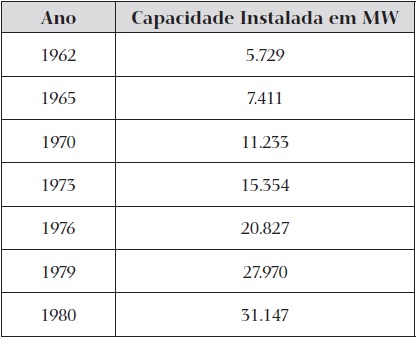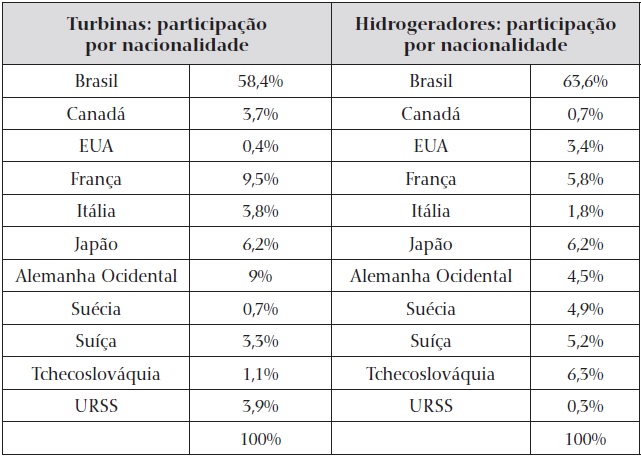 Nesse sentido, se até meados da década de 1950 o país dependia essencialmente de equipamentos importados para atender o crescimento da geração de energia demandada, no início dos anos 1960, com a chegada das multinacionais, é possível afirmar que já existia uma produção desenvolvida no país disponível para os novos empreendimentos hidrelétricos em construção (tabela 1). Cumpria-se, assim, a meta número 29 do Plano de Metas, de produzir no país equipamentos como turbinas hidráulicas, geradores, transformadores e motores com potência acima de 20 HP.