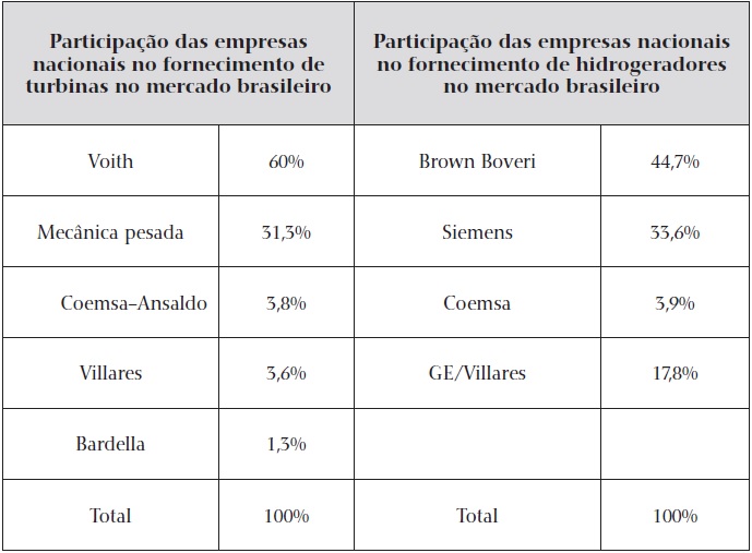 Em suma, com a chegada das multinacionais no país, o fornecimento de bens de capital dos projetos hidrelétricos brasileiros pode superar o modelo dominante nas décadas anteriores, nos quais prevaleciam recursos financeiros internacionais, como do Banco Mundial e do Eximbank, e os equipamentos que compunham as usinas eram na essência importados. Somente os equipamentos menos sofisticados restavam para a concorrência das empresas atuantes no mercado interno.