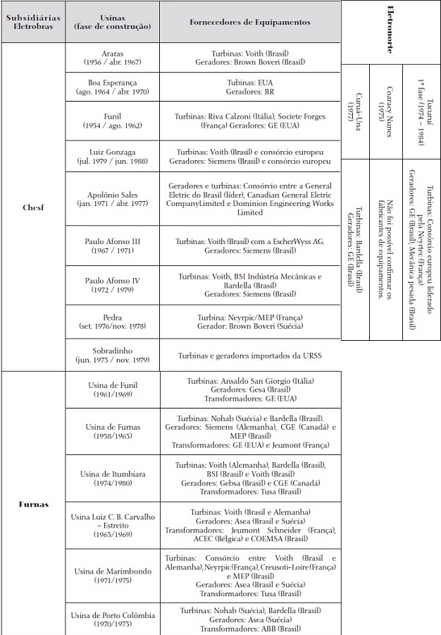 Apresentamos a seguir o inventário dos bens de capital sob encomenda para o setor elétrico, com destaque para as turbinas, os geradores e os transformadores, que compuseram as usinas Eletrobras construídas entre 1960 e 1980. A investigação foi estabelecida considerando as cinco subsidiárias da empresa, isto é, a Chesf, Furnas, Eletrosul, Eletronorte e Eletrobras Amazonas.41 Para o artigo, todavia, consideramos apenas as usinas que foram construídas no período de 1960 a 1980 (conferir Anexo II), inclusive aquelas usinas que começaram a ser construídas antes da formação da Eletrobras, mas que foram posteriormente integradas ao sistema. Por outro lado, a Eletrosul e a Eletrobras Amazonas, cujas hidrelétricas foram construídas somente depois de 1980, não serão examinadas neste artigo.42