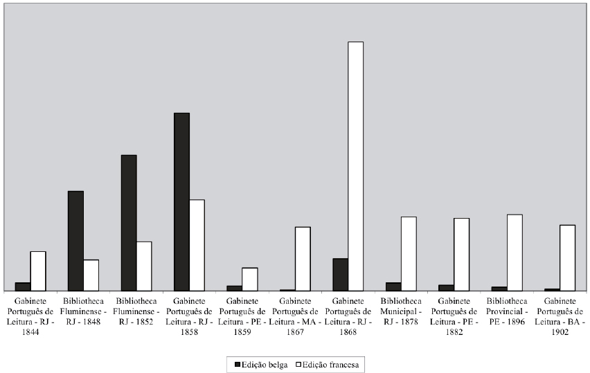 Por sua vez, o exame da composição dos fundos de prosa de ficção editada na língua francesa revelou um aspecto até então pouco conhecido nas relações comerciais franco-luso-brasileiras, isto é, a presença de obras pirateadas ou de contrafações. Na contramão de inferências arriscadas que naturalizam a produção do livro em língua francesa como um produto genuinamente francês, a leitura minuciosa dos catálogos explicita que em algumas instituições a quantidade de obras provenientes da Bélgica sobrepujava aquelas produzidas na França. Nesse sentido, a distribuição de obras editadas em língua francesa denotava a repercussão no mercado livreiro do Brasil das disputas pela hegemonia comercial travada entre a França e a Bélgica, durante a primeira metade do século XIX.