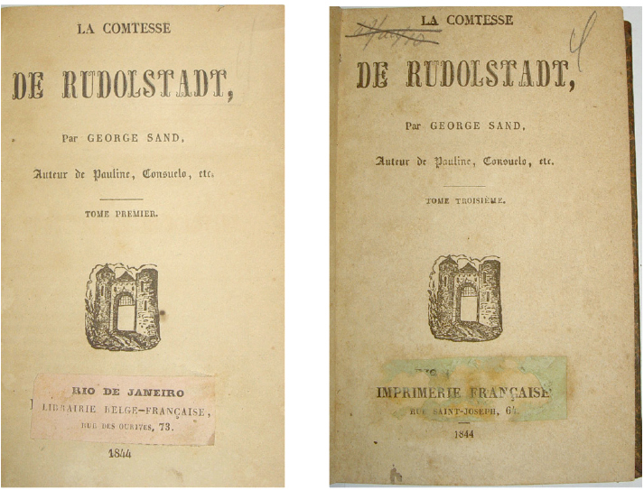 Ao consultar as obras belgas do Real Gabinete Português de Leitura do Rio de Janeiro verificou-se que Desiré-Dujardin não foi apenas mais um livreiro estrangeiro radicado na cidade. Ao manusear o tomo III de La comtesse de Rudolstad (1844), de George Sand, constatou-se que o livreiro havia adulterado aquilo que Lucien Febvre e Henri-Jean Martin designaram de "registro civil do livro",24 isto é, as marcas do impressor. Ele havia colado uma etiqueta com a identificação de seu estabelecimento sobre a identidade da oficina que havia produzido o livro, a saber: Imprimiere Française (R. Saint Joseph, 64), 1844. O tal feito indica uma ardilosa forma de autopromoção ou publicidade que conferia ao livreiro a capacidade de perscrutar o mercado europeu, obter algum título sob a forma de ponta de estoque e oferecer de forma rápida aos leitores brasileiros um autor de grande acolhida naquele momento. E, de quebra, obter lucro na operação comercial.