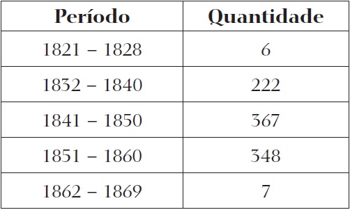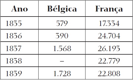 A leitura dessa tabela permite constatar que a presença de livros belgas desponta de forma significativa a partir de 1832, cresce cerca de 65% nos anos 1840 e, após um pequeno decréscimo nos anos 1850, despenca vertiginosamente nos anos 1860, com um número quase insignificante de exemplares. Esse movimento reitera a imensa capacidade de comercialização e rápido escoamento dessa mercadoria, que, de acordo com Jules Hetzel, fazia uso da venda a baixo preço e a longo prazo, da prática da consignação e da capacidade de oferecer livros sob formatos adequados aos gostos e exigências do mercado estrangeiro.11