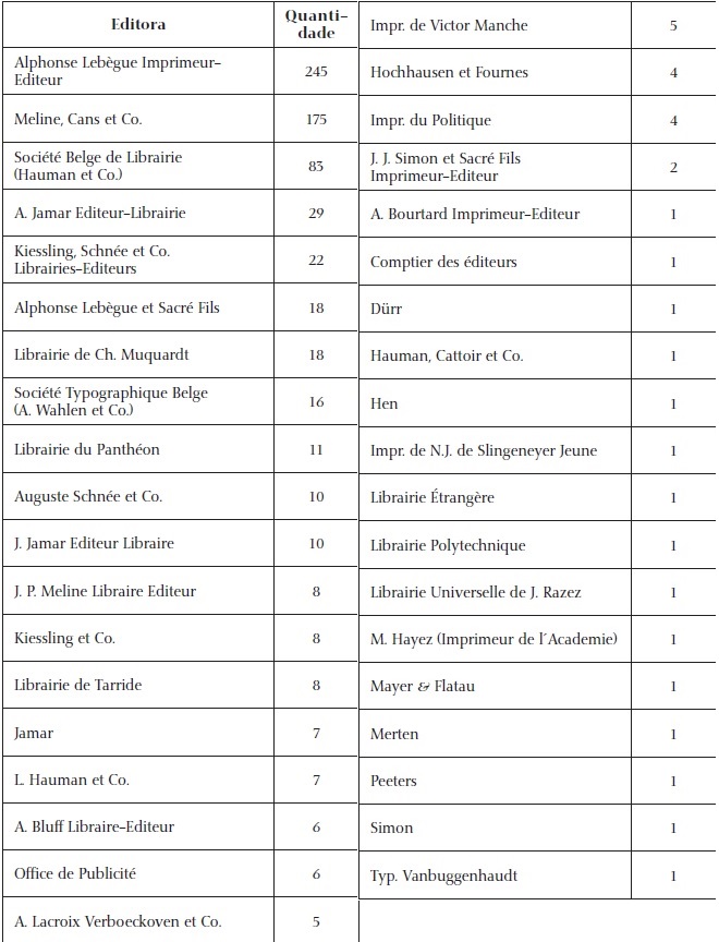 A tabela ilustra a transição da pequena manufatura ou da empresa familiar, que empregava poucos funcionários e tecnologia tributária da força motriz dos seus trabalhadores, para a maquinofatura, que exigia um corpo mais diversificado de operários especializados, o emprego de rotativas movidas a vapor e a inversão maciça de capitais. Reforçando essa linha argumentativa, vamos encontrar uma empresa jornalística que empregará o tempo ocioso de suas rotativas para a produção de livros (Imprimerie du Politique), uma livraria que encomenda os livros supostamente destinados ao uso escolar (Librairie Polytechnique) e também duas grandes empresas que foram fundadas com o objetivo de reproduzir e exportar as obras de escritores franceses, ingleses, alemães e italianos (Société Typographique Belge e Société Belge de Librairie). Também é importante acrescentar a concentração geográfica da edição belga nesse conjunto de livros arrolados nos catálogos consultados, em que se verificou a presença de 942 livros provenientes dos prelos de Bruxelas e de apenas 18 produzidos em Gand.