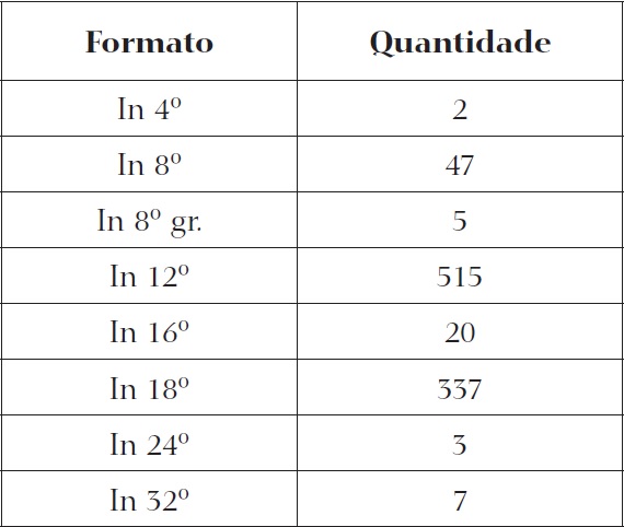 O expressivo número de obras impressas nos formatos in 12º e in 18º indica uma opção deliberada por edições mais baratas, o que, de certo modo, garantia o rápido incremento do acervo das novas bases institucionais de leitura e saciava o desejo dos leitores de sintonizarem-se com a produção cultural europeia.