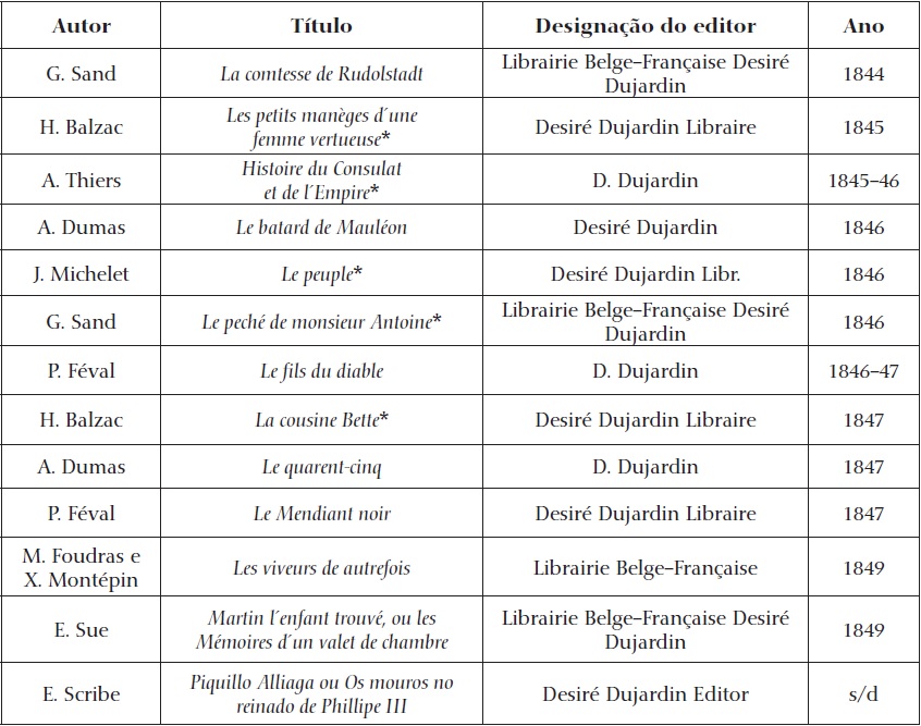 Por sua vez, essa pesquisa conseguiu ampliar os dados obtidos por Godfroid, uma vez que ele localizou e atribuiu apenas cinco títulos ao livreiro Dujardin na categoria dos editores estrangeiros impressos na Bélgica.27 Conforme os dados expostos no quadro a seguir, o mapeamento das atividades editoriais de Dujardin possibilitou identificar no total 13 títulos.