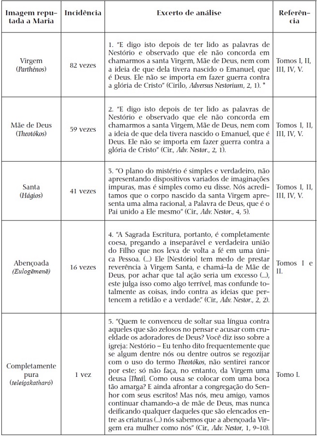 Aqui, realizamos um levantamento sistemático da ocorrência, nos cinco tomos, dos termos: Parthénos, Theotókos, Hágios, Eulogēmenē e teleío̱skatharó, com o objetivo de propor um esquema analítico-quantitativo.52 De tal modo, fizemos um inventário dos atributos reputados a Maria, que foram empregados por Cirilo, com o objetivo de detalhar o discurso do bispo e de definir uma visão geral sobre a composição retórica do autor.