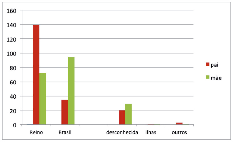 Entre os comissários do Brasil, de 198 pais cuja naturalidade é conhecida, 139 eram reinóis - na sua maioria do Minho (78)12 -, 35 eram naturais da colônia, um era das ilhas, um de Angola e três tinham nascido no estrangeiro; para 20 não foi possível saber a naturalidade. No caso das mães, a tendência era a inversa: predominavam as mulheres nascidas no território americano - 95. As mães reinóis somavam 72 pessoas.13 Além dessas, uma era das ilhas e outra de Angola. Em 29 casos, não foi possível identificar o local de nascimento. Mesmo na Madeira, era maior o número de mães ali nascidas do que o número de pais.