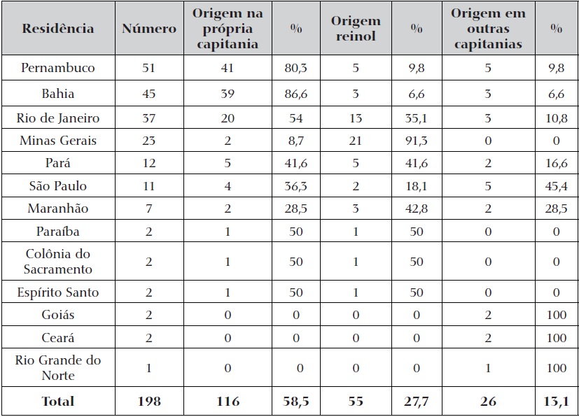 Naquele território, considerando o clero globalmente e do ponto de vista geográfico, três capitanias se destacavam com comissários de sua própria terra: Pernambuco, Bahia9 e Rio de Janeiro. Os reinóis tinham um peso relevante apenas em Minas Gerais e no Maranhão. Nesta última, eram poucos em números absolutos: apenas sete agentes, dos quais três eram do reino.