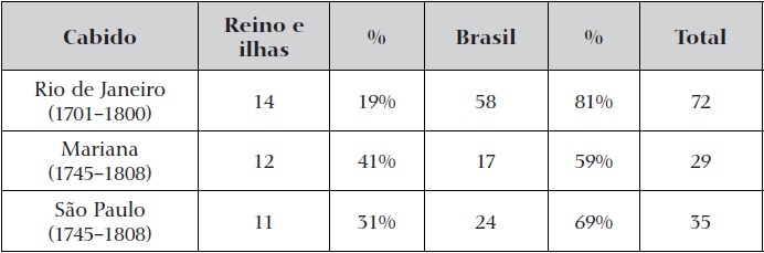 Na Sé do Rio, entre os providos no século XVIII, apenas 13 clérigos eram originários do reino e um, dos Açores; os demais 58 (de um universo de 72 capitulares cuja naturalidade é conhecida) eram naturais da própria colônia (Tabela 5).82