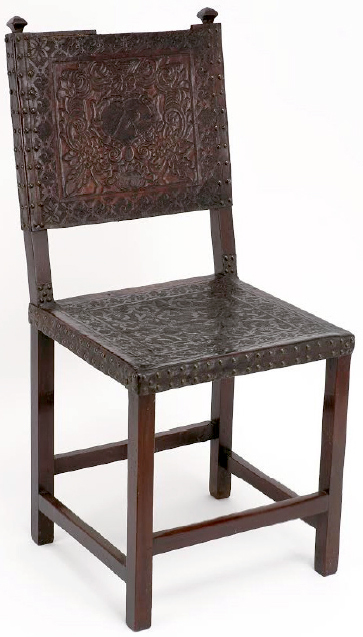 No Museu Paulista, temos um exemplar de uma cadeira de sola que pertencera ao rico proprietário de terras Antônio de Barros Penteado,90 residente na vila de Itu. É uma cadeira de jacarandá do século XVII, em linhas retas, de construção rústica, assento e espaldar guarnecidos de sola lavrada com cercadura e ramagens; no centro do espaldar, cartela com flores com o monograma “AP”. Nos ângulos, remate de madeira em ectaedro. Pregaria de pequenas cabeças de latão. Pernas retas, angulares, com travessas simples91 (Imagem 5).