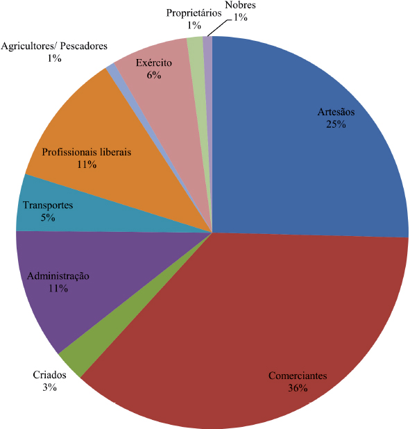 Os dados do Gráfico 1, que representam a composição socioprofissional da amostra, espelham o resultado de um processo de classificação marcado por algumas dificuldades e dúvidas. De fato, a ambiguidade e opacidade do vocabulário social constituiu uma dificuldade e implicou opções que importa justificar. É sobejamente conhecido que a organização do trabalho e do mundo dos ofícios no Antigo Regime impunha uma contiguidade entre as atividades comercial e artesanal, tornando difícil o estabelecimento de fronteiras entre os dois setores. Partindo deste pressuposto, e como forma de ultrapassar esta dificuldade, no processo de classificação tivemos em conta a natureza dos bens comercializados e a organização do setor em causa. Consideramos que não basta ter loja para se ser lojista. Era preciso também estar desvinculado do processo produtivo. Concretizando: um indivíduo com loja de sapateiro por estar ligado à produção e comercialização dos bens que produzia foi considerado um artesão; ao passo que um indivíduo com loja de retrós, por estar à partida desvinculado da produção e concentrar a sua atividade na comercialização, foi enquadrado no comércio. No caso de designações polissêmicas, como é o caso de capitão, que tanto designa um capitão de navio como um cargo militar, optamos por assumir, por defeito, a segunda. Assim, na falta de qualquer referência em sede de inventário que nos reportasse para a atividade marítima, assumimos uma ligação ao exército.