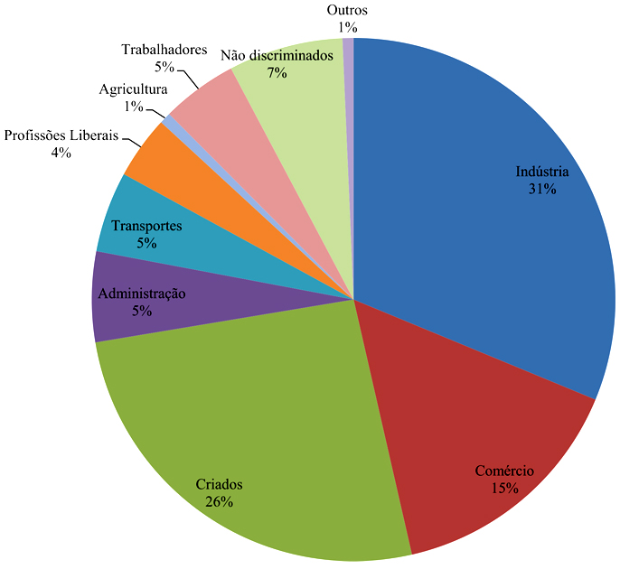 Por imperativos de comparabilidade da amostra com os estudos disponíveis, optamos por utilizar a classificação socioprofissional usada por Jorge Borges de Macedo no estudo que desenvolveu sobre a estrutura da população ativa em Lisboa entre 1763-1769. Assim, os indivíduos foram agrupados em função dos setores de atividade a que estavam ligados (agricultura, pesca, indústria, comércio e serviços, onde discriminamos os transportes, a administração, as profissões liberais e os criados). A estes acrescentámos o exército, os “pequenos proprietários” (indivíduos identificados como “vivendo de suas fazendas”) e os nobres.