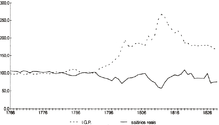 É importante referir que a dinâmica econômica da transição do século XVIII para o século XIX ficou marcada pela alta de preços.39 Esta subida teve causas exógenas, pois decorreu da inflação verificada nas economias europeias, reflexo do estado de guerra que se vivia, e endógenas, na medida em que refletiu o impacto negativo da primeira experiência de emissão de papel-moeda em Portugal a que o Estado recorreu para fazer face ao seu endividamento.40 De fato, além dos problemas sentidos no setor industrial e comercial, a crise financeira do Estado, com início na década de 90 do século XVIII, correspondeu ao culminar de uma situação de desequilíbrio estrutural que contribuiu para um quadro pouco favorável no início do século XIX.41 No que concerne aos salários reais, estes sofreram uma quebra significativa que penalizou o trabalho qualificado (mestres pedreiros e carpinteiros) em 50%, e o trabalho não qualificado em 66%.42 Vejamos o Gráfico 3 que representa a evolução dos dois indicadores em Lisboa.
