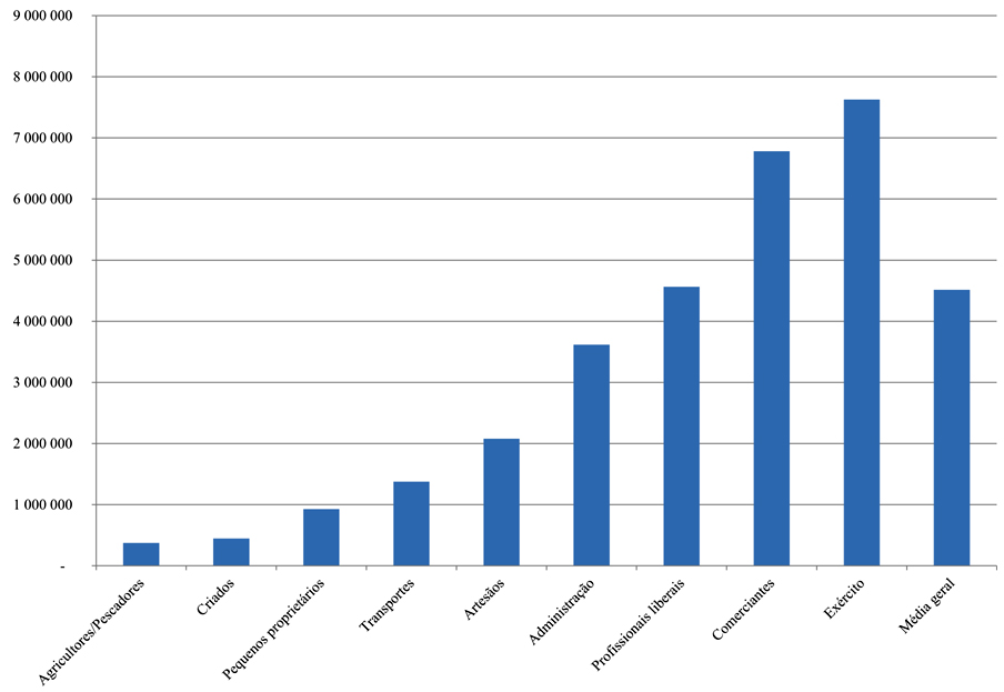 O resultado desta análise está materializado no Gráfico 4 que permite uma leitura global dos níveis de riqueza médios dos diferentes grupos socioprofissionais e a sua hierarquização. Da sua análise é possível observar, sem surpresa, o baixo nível de riqueza dos grupos ligados à atividade agrícola e piscatória, bem como dos criados. Destaca-se também o grupo dos pequenos proprietários, dos indivíduos relacionados com os transportes e dos artesãos com fortunas médias entre cerca de 1.000.000 e 2.000.000 réis; um terceiro grupo, constituído pelos profissionais liberais e indivíduos relacionados com a administração, que evidencia níveis de riqueza mais próximos da média geral que se situa nos 4.500.000 réis, e um quarto grupo, composto pelos comerciantes, membros do exército e da nobreza, constituído apenas por um elemento, que apresenta fortunas médias superiores a 6.000.000 réis.