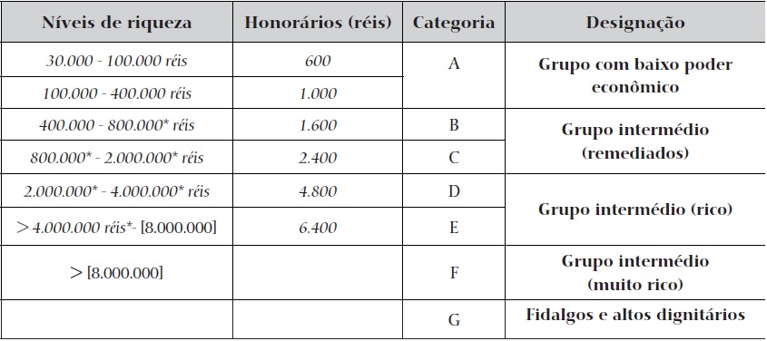 Entendemos que o critério é significativo porque recorre a uma classificação coeva indissociável da própria fonte. O Quadro 1 resume os intervalos de riqueza, bem como o pagamento previsto na lei (cf. itálico).
