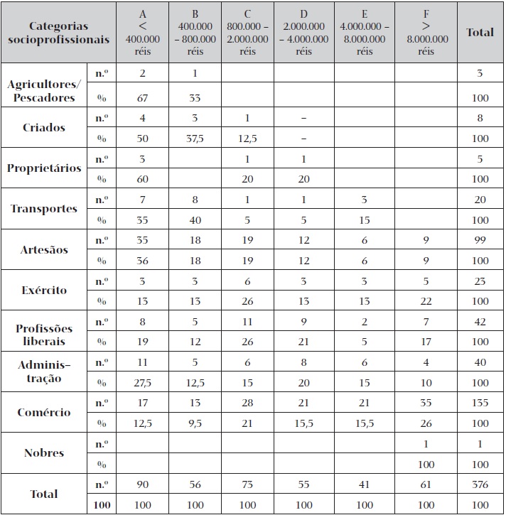 O quadro permite desde logo vislumbrar as categorias socioprofissionais mais frequentemente associadas a baixos níveis de riqueza. É o caso dos agricultores e pescadores, dos criados, dos proprietários, assim como dos trabalhadores relacionados com os transportes e dos artesãos, cuja maioria se enquadra nas categorias de menor riqueza (A e B). Estas ocupações socioprofissionais que compõem um grupo que, por esse motivo, podemos considerar economicamente menos favorecido, revelam uma relativa homogeneidade nos níveis de riqueza. Dentro desse grupo destacamos apenas os artesãos uma vez que, apesar da maior parte dos seus elementos (54%) se enquadrar nas duas primeiras categorias e de a categoria A ser a sua classe modal, existem artesãos em todas as classes de riqueza. As fortunas superiores a 2.000.000 réis não são propriamente uma exceção, representando cerca de um quarto do total dos artesãos. No entanto, é importante salientar o perfil diferenciado dos artesãos que integram estas classes de riqueza (D, E e F), uma vez que entre estes encontramos fabricantes (3), mestres-de-obras (3), indivíduos que trabalham metais preciosos, como ourives (1), mestres douradores (2), que produzem bens diferenciados, como os confeiteiros (3), livreiros (1), sombreireiros (1), mestres cabeleireiros (1) ou destinados a um mercado especializado, como os carpinteiros de seges (2), um fabricante de órgãos (1) e um relojoeiro (1).
