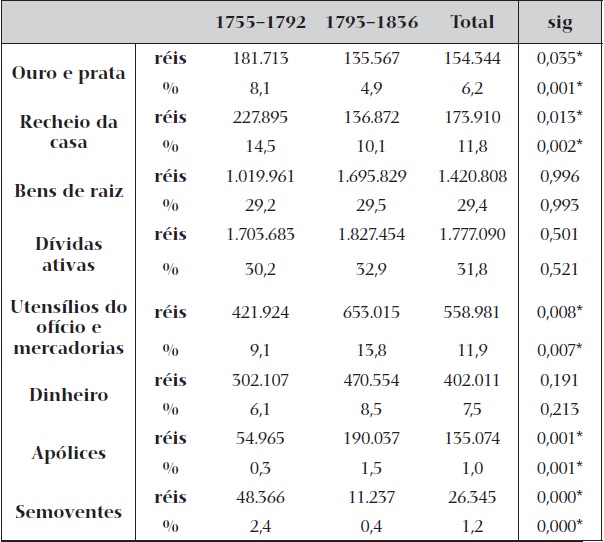 Os dados sobre esta conjuntura fundamentam a linha de corte estabelecida para efeitos da presente análise, que tomará a década de 1790 como coordenada fundamental, por corresponder ao início de um ciclo de alta de preços, que só termina em 1813. A partir daí a linha dos salários reais reaproxima-se da linha do custo de vida. No entanto, diga-se, a reaproximação é real, mas a convergência insuficiente, pelo que os salários reais no século XIX não retomam os níveis das décadas de 60-80 do século XVIII.43 Ora, é expectável que o aumento dos preços e o declínio dos salários reais acarretem um agravamento do custo de vida e que este se repercuta sobre a poupança e o consumo interno, refletindo-se eventualmente, a médio prazo, nos níveis de riqueza e na composição da fortuna dos agregados. É a dimensão e expressão destas ondas de choque que pretendemos captar. Para tal procederemos à divisão da amostra em dois períodos: 1755-1792 e 1793-1836.