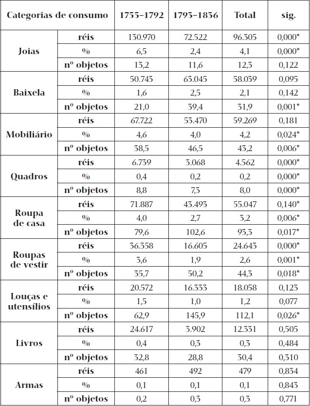Um dos dados mais relevantes que retiramos da análise do comportamento de consumo consiste no decréscimo significativo do valor médio das joias avaliadas. Trata-se, diga-se, de uma tendência transversal a todos os grupos e não de uma especificidade dos grupos intermédios. É também notória uma diminuição do peso relativo que as jóias detêm no patrimônio, bem como do número médio de adornos descritos nos inventários. Refira-se que as diferenças do valor médio e do peso relativo, apuradas com base na comparação de médias, são estatisticamente significativas.