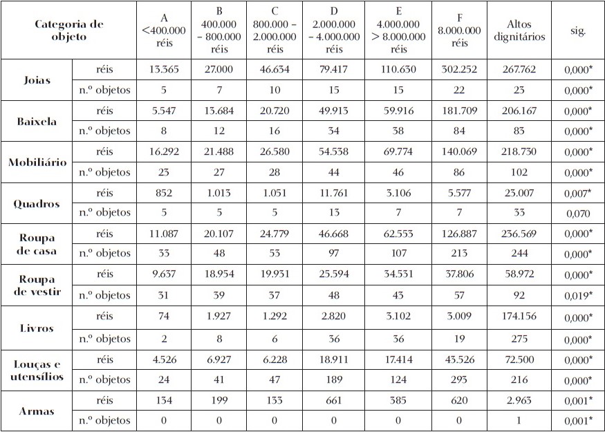 Quando confrontamos o investimento das diferentes categorias socioeconômicas nas diferentes componentes do patrimônio móvel, concluímos que existem diferenças estatisticamente significativas (cf. anexo 1). É que, apesar das camadas A, B, C, D e E corresponderem a um conjunto relativamente homogêneo em relação ao total despendido nas várias categorias de consumo, verificam-se diferenças significativas que permitem opor estes grupos ao dos altos dignitários e ao grupo F, e, por vezes, mesmo estes dois entre si. Concretizemos: os altos dignitários destacam-se claramente dos demais pelo valor médio investido em armas e livros, bem como no número médio de livros, armas, quadros e peças de roupa de vestir; têm um comportamento diferenciado de consumo relativamente a todos os grupos, mas semelhante ao grupo F, quanto ao valor médio investido em joias e na baixela, assim como no número médio de objetos que a compõem, no número de itens de roupa de casa e mobiliário. Importa destacar que, relativamente ao valor médio pelo qual é estimada a roupa de casa e o mobiliário, os altos dignitários se destacam do grupo F, que por sua vez se demarca de todos os outros.
