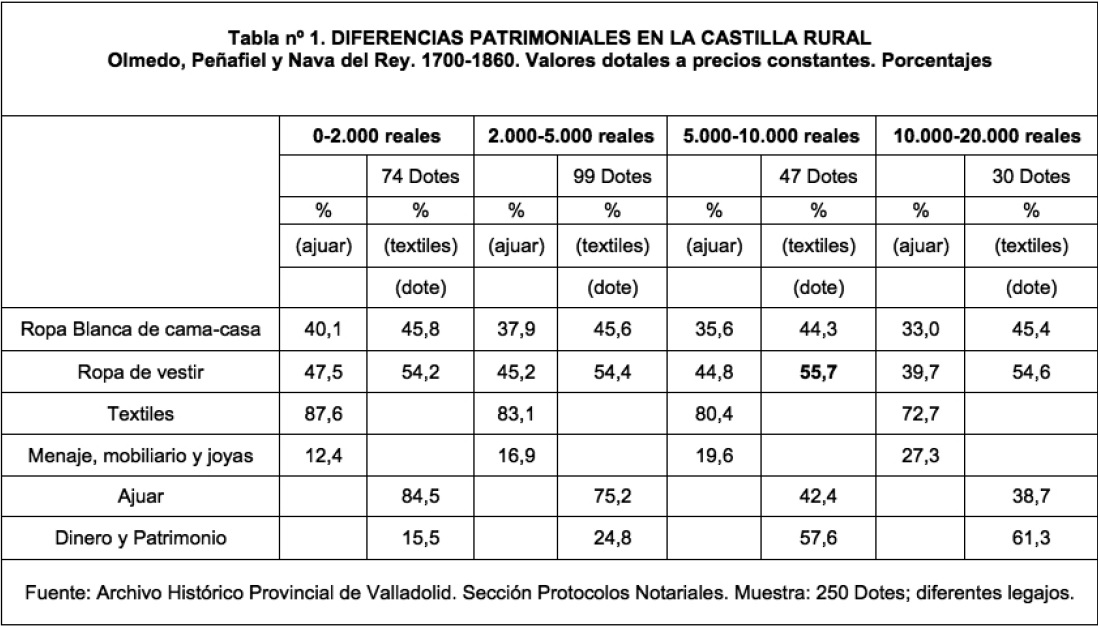 En el mundo rural castellano (también en el urbano) existe una nítida presencia diferenciada de enseres del hogar y de productos textiles en función de la estructura patrimonial y de la valoración de las dotes femeninas. Aun así, los complementos y vestidos de las dotaciones tasadas entre cinco y diez mil reales constituían porcentajes mucho más importantes que los del resto de las piezas recibidas al inicio del ciclo doméstico en relación, incluso, con familias con aportes muy superiores22 (Tabla nº 1).
