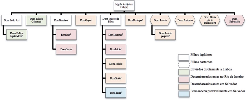 Como se vê, trata-se de uma família extensa, composta por descendentes de primeira e segunda geração de dom Felipe, que havia morrido em 1664. Ele havia sido o último dos reis do Ndongo a permanecer fiel aos portugueses e talvez por isso a descrição de todas as relações de parentesco o tome por referência. Designados pelo título de “dom” ou como “príncipes negros”, e apenas por seus nomes católicos, foram tratados sempre com deferência, explicitando-se o pertencimento à realeza do Ndongo.