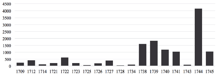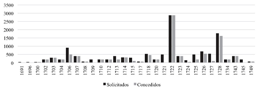 Mesmo assim, entre início da década de 1690 até meados de 1740, contamos um total de 12.730 índios solicitados pelos moradores e 10.380 imediatamente deferidos pelo rei - excluindo dos cálculos as solicitações para as quais o rei encomendou parecer do governador e cuja resposta não conhecemos. Foram poucos os índios solicitados na década de 1690, quando a prática estava ainda em seu início, e uma média de 300 solicitados anualmente entre as décadas de 1700 e 1710. A partir de então, com mostra o gráfico a seguir, houve um aumento do número de índios solicitados. E, além disso, dois grandes picos: em 1722, foram requisitados 2.860 indivíduos, um número quase dez vezes maior do que a média anual até então; o outro pico, um pouco menor, aconteceu no ano de 1728, quando foram solicitados 1.800 indivíduos. O que explica essas variações?