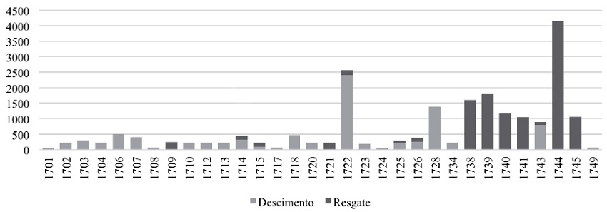 A prática de licenças a particulares para a realização de descimentos cresceu durante toda a primeira metade do século XVIII, tornando-se mais acessível a outros estratos da população, que não apenas os que tinham cabedal para grandes empreendimentos. Observamos ainda que, entre as décadas de 1730 e 1740, quando a demanda por trabalho atingiu seu apogeu, as práticas de resgates substituíram os descimentos como mecanismo mais comumente utilizado.