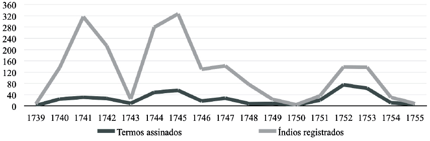 Encontramos para esse período registros de índios que chegavam em Belém sem as devidas certidões de compra assinadas pelo padre e, sendo assim, tinham que passar pela Secretaria de Estado, onde a pessoa responsável por eles assinava um termo no qual se comprometia a apresentar as certidões dentro de uma semana a quinze dias, ou a reapresentar os índios para exame dentro de um ano. Trata-se do Livro das canoas.57 Este livro foi aberto em 1739 e, deste ano até 1755, quando foi fechado, registrou 452 termos referentes a um total de 2.030 índios. Da sua tabulação elaboramos um gráfico das variações do montante de registros e de índios registrados ao longo do período.58
