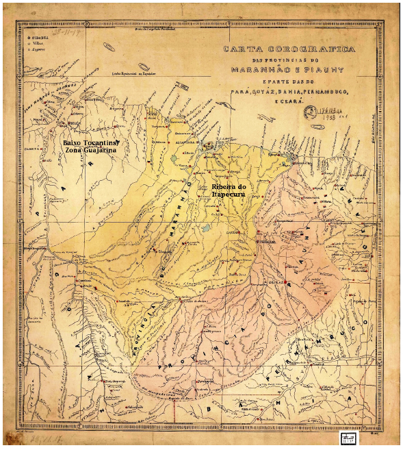 A Ribeira do Itapecuru, o Baixo Tocantins e a Zona Guajarina eram, do ponto de vista econômico e demográfico, os mais sobressaídos redutos escravistas do Maranhão e do Grão-Pará respectivamente. Além de esses espaços concentrarem, como observaremos mais adiante, partes por certo expressivas das populações cativas do Maranhão e do Grão-Pará, os gêneros agroextrativistas produzidos nesses espaços representavam partes de igual modo expressivas das pautas de exportação maranhense e paraense. Enquanto a Ribeira do Itapecuru era responsável por cerca de dois terços do algodão e do arroz produzidos no Maranhão5 em pleno período do chamado “renascimento agrícola”,6 o Baixo Tocantins e a Zona Guajarina produziam praticamente todo o açúcar e fração importante do cacau exportados pelo Grão-Pará ao longo de toda a primeira metade do Oitocentos.7