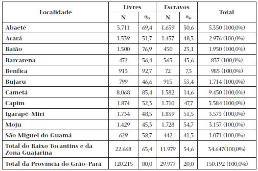 Este fluxo de cativos contribuiu de modo inconteste para a consolidação de sistemas agrários (Maranhão) e agroextrativistas (Grão-Pará) embasados no uso de mão de obra escrava de origem africana. Embora parte da primeira metade do século XIX tenha sido marcada pela desestruturação das estatísticas brasileiras,14 as obras de caráter corográfico elaboradas por Antônio Bernardino Pereira do Lago e Antônio Ladislau Monteiro Baena podem servir como parâmetro para a efetividade demográfica da escravidão no Maranhão e no Grão-Pará nos anos de 1820. Não obstante as limitações técnicas e os juízos de valor inerentes às narrativas corográficas daquela época, trata-se talvez das melhores informações de que dispomos acerca das características mais gerais da população do Maranhão e do Grão-Pará no limiar do Oitocentos.
