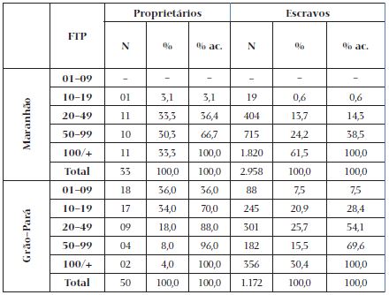 No que é atinente aos termos da propriedade escrava e ao seu grau de concentração, verificamos que o grau de concentração da posse de cativos na Ribeira do Itapecuru (regular) era inferior ao do Baixo Tocantins e da Zona Guajarina (moderadamente forte). Embora a nossa amostra de inventários post-mortem para o Maranhão tenha se mostrado menos sensível aos pequenos (de 0 a 9 cativos) e médios (de 10 a 19 cativos) proprietários que nossa amostra de inventários post-mortem para o Pará, foi possível observarmos que a maioria dos cativos estava concentrada nos plantéis grandes (de 20 a 49 escravos), muito grandes (de 50 a 99 cativos) e nos megaplantéis (de 100 ou mais cativos) tanto na Ribeira do Itapecuru, como no Baixo Tocantins e na Zona Guajarina - neste caso, replicando um padrão existente nessas microrregiões desde o final do século XVIII.