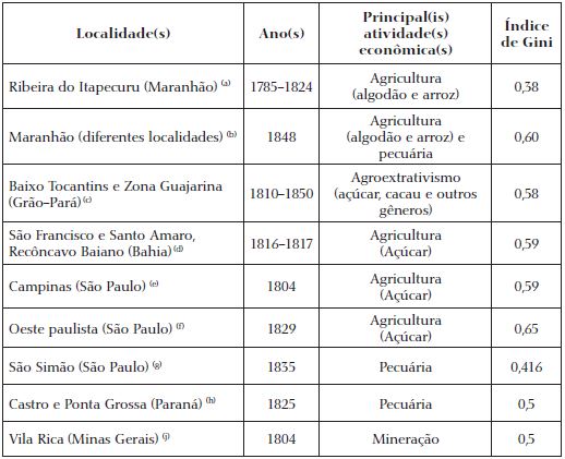 Isso posto, não obstante o caráter provavelmente enviesado dos inventários post-mortem concernentes à Ribeira do Itapecuru e o fato de a maior parte dos estudos acima referidos ter lançado mão dos recenseamentos antigos e não de inventários post-mortem - o que teoricamente coloca-nos diante da mesma ordem de problema apontada anteriormente, na altura da comparação entre os dados de nossa amostra para o Maranhão e os de Marcondes -, os dados disponíveis na tabela 4 sinalizam que o grau de concentração da posse de escravos no Baixo Tocantins e na Zona Guajarina entre os anos de 1810 e 1850 era equivalente aos graus de concentração da propriedade escrava em outros importantes centros produtores (e exportadores) de gêneros agrícolas no Brasil da primeira metade do século XIX - a exemplo de Campinas (São Paulo) e de São Francisco e Santo Amaro (Recôncavo Baiano). Cabe-nos advertir que aqui estamos nos reportando unicamente aos termos de (des)igualdade da posse de escravos e não às suas características.