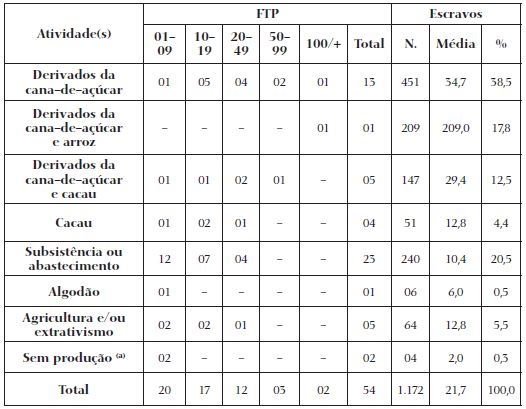 Comungando com uma orientação presente nos estudos sobre a estrutura da posse de cativos no Brasil, dividimos as propriedades escravas arroladas conforme as atividades econômicas características principais dos inventários post-mortem, o que não implica, vale frisar, a desconsideração da existência de todo um conjunto de atividades cotidianas por parte dos cativos que visavam ao atendimento de suas necessidades básicas e eram de suma importância no contexto produtivo dessas propriedades. A princípio, tal procedimento desvelou uma característica fundamental do sistema agroextrativista estabelecido no Baixo Tocantins e na Zona Guajarina, que o diferenciava do sistema agrícola estabelecido na Ribeira do Itapecuru: a presença marcante da policultura. Parte considerável das propriedades paraenses analisadas, independentemente da quantidade de cativos que possuíam, voltava-se à produção de mais de um gênero, simultaneamente, não se encaixando na clássica definição de plantation, no que toca a seu caráter monocultor.